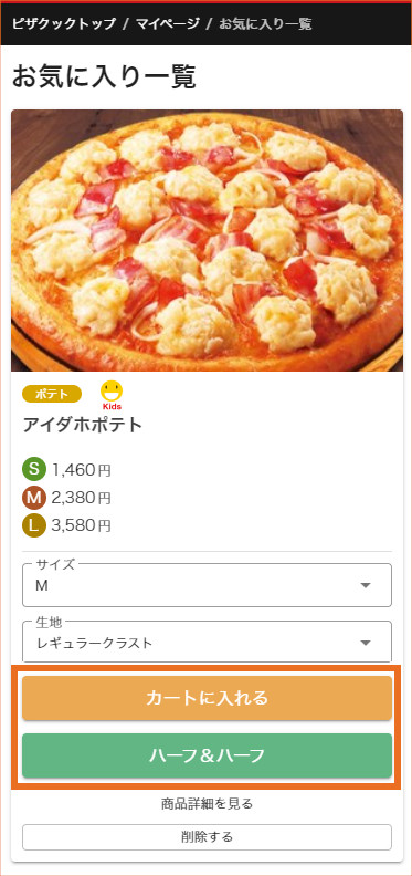 ※ピザ以外、またはハーフ&ハーフ設定不可のピザは表示されません。